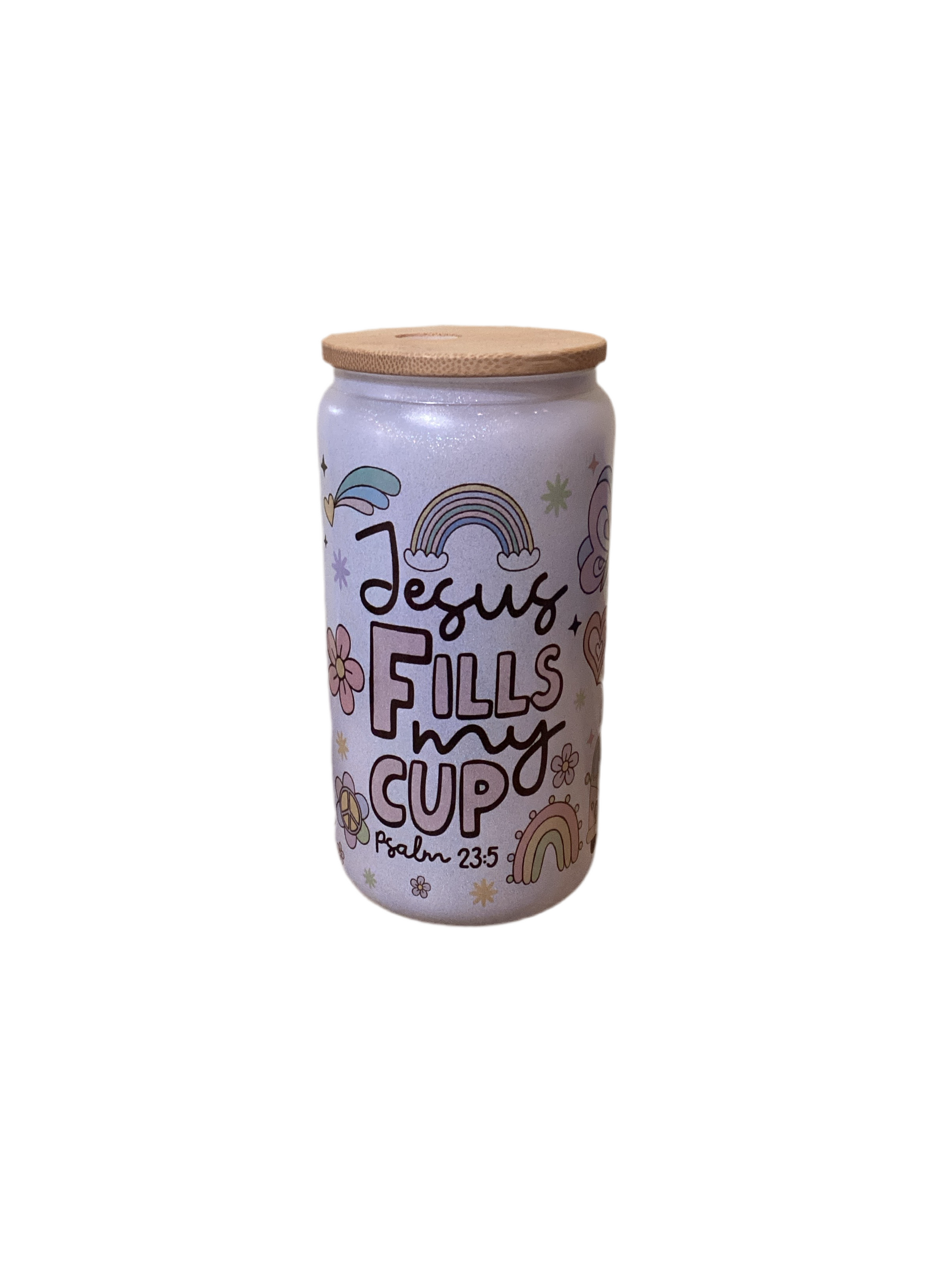 Let your faith shine with our 16 oz Glitter Glass Cup - Jesus Fills My Cup.